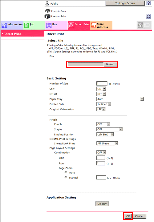 Connect to Web Connection using a Web browser, then specify the file you want to print. You can print PDF (Ver.1.6), JPEG, TIFF, XPS, PS, PCL, Text, OOXML (.docx/.xlsx/.pptx) and PPML (.ppml/.vdx/.zip) format files.
