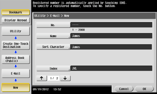 Tap [Utility] - [One-Touch/User Box Registration] - [Create One-Touch Destination] - [Address Book (Public)] - [E-Mail] - [New].