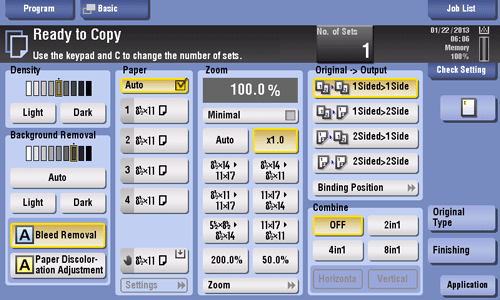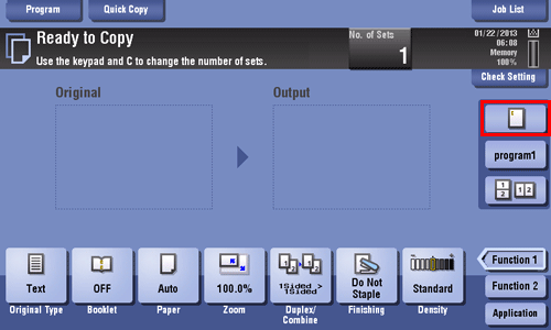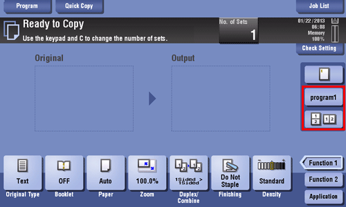 You can arrange a key in which a combination of finishing settings is registered (finishing program) in the main screen in the copy mode. If you arrange the frequently used combination of finishing settings as a recall key in the main screen, it will be useful to specify the setting with a single key action.