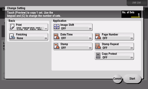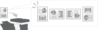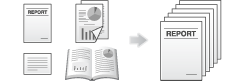 Originals are scanned with different settings for each set, and copied collectively. Use this function when various types of originals are mixed, such as 1-sided original to be printed on one side of paper, and 2-sided original to be copied by enlarging. After all originals have been scanned, you can add page numbers or finishing functions, such as sort, to copy them.