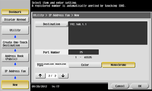 You can also register IP address fax destinations using Web Connection. For details, refer to Here.