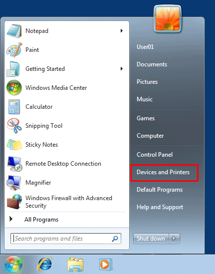 In Windows 7/Server 2008 R2, click the Start menu, then select [Devices and Printers].