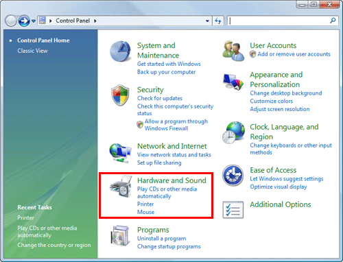 In Windows Vista/Server 2008, click the Start menu, and select [Control Panel] - [Hardware and Sound] - [Printer].