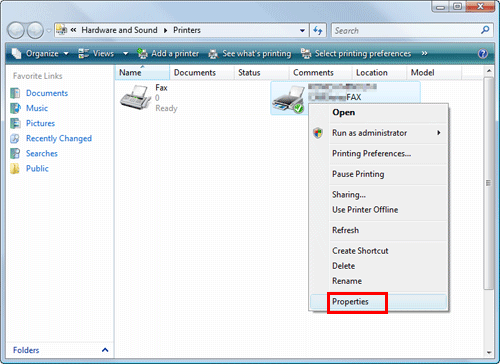 In Windows 7/8/8.1/Server 2008 R2/Server 2012/Server 2012 R2, right-click the icon of the installed printer, and from [Printer Properties], click the displayed printer name.