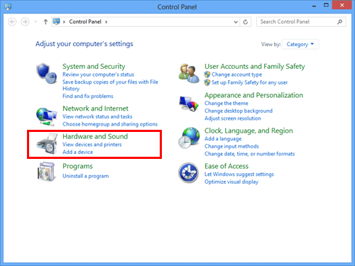 In Windows Server 2012/Server 2012 R2, open the Start window, then click [Control Panel] - [Hardware] - [View devices and printers].