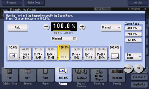 Fixed Zoom | Select a preset zoom when copying from a standard size original onto a standard size sheet of paper. The paper tray is selected automatically according to the selected zoom ratio. |