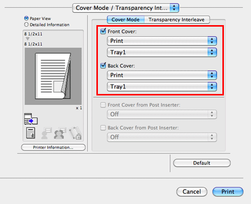 In [Cover Mode / Transparency Interleave] or [Cover Mode] (Mac OS X 10.7 or later), select the [Front Cover from Post Inserter:] and [Back Cover from Post Inserter:] check boxes.