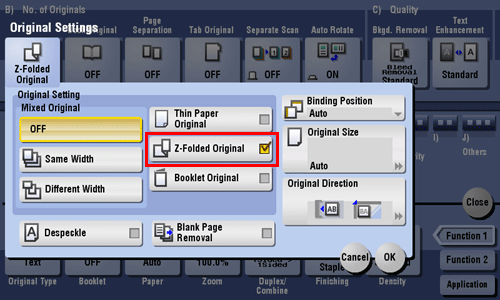 Originals are scanned with different settings for each set, and copied collectively. Use this function when various types of originals are mixed, such as 1-sided original to be printed on one side of paper, and 2-sided original to be copied by enlarging.