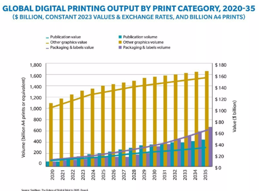 A landmark study from research experts Smithers1 confirms the scale of the shift. Digital printing is now firmly established in books, mailings, display, security and labels with adoption in packaging, magazines and commercial print2