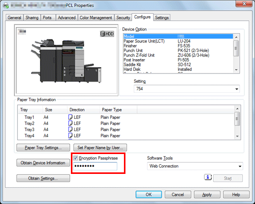 If OpenAPI communication is SSL-encrypted and the device information can be automatically obtained from the printer driver, the encrypted passphrase can be obtained from this machine. For details on how to encrypt OpenAPI communication with SSL, refer to Here.